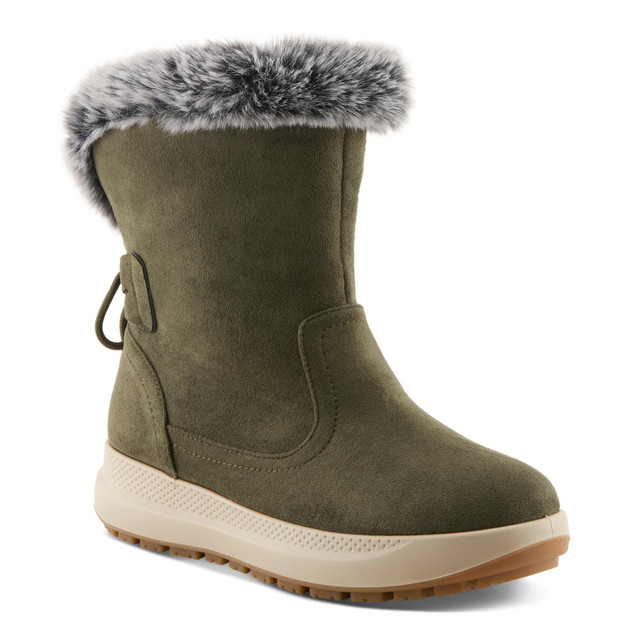 Stay warm and stylish in Flexus Snowbird Mid-Calf Boots. These waterproof boots feature a cozy fleece lining, plush faux fur cuff, and a decorative back lace for added charm. Designed with a flexible sole and padded insole, they offer all-day comfort and traction for snowy days. Perfect for everyday winter wear.