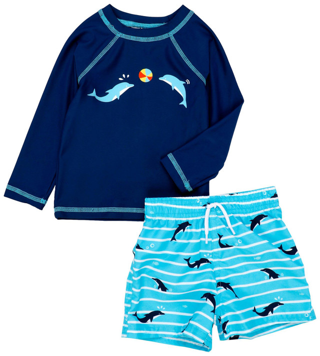 Stay protected and stylish with this 2 Pc Dolphin Rash Guard Shorts Set. Designed for active days at the beach or pool, this set includes a UPF 50+ long sleeve rash guard top and coordinating swim shorts for full sun protection and all-day comfort. The lightweight, quick-drying fabric ensures ease of movement, while the sporty design adds a modern touch. Ideal for swimming, surfing, or play. Fabrication is: Rash Guard 82% polyester, 18% spandex, Shorts 100% polyester.