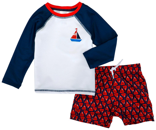 Introducing the Baby Boys 2 Pc Swim Shorts Set, crafted from a blend of polyester and spandex for comfort and flexibility. This fun set includes a long sleeve rash guard featuring a sailboat on the chest and raglan style sleeves, paired with sailboat print swim shorts. Perfect for beach days and poolside adventures, this set combines style and practicality.