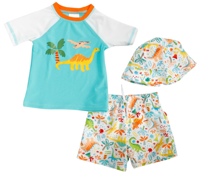 Introducing the Baby Boys 3 Pc Swim Shorts Set, designed for ultimate sun protection and style. This set includes a short sleeve rash guard with UPF 50+ protection, ensuring your little one stays safe from harmful UV rays. The dinosaur print swim shorts add a fun touch, while the matching hat completes the look, making it perfect for beach or pool adventures.