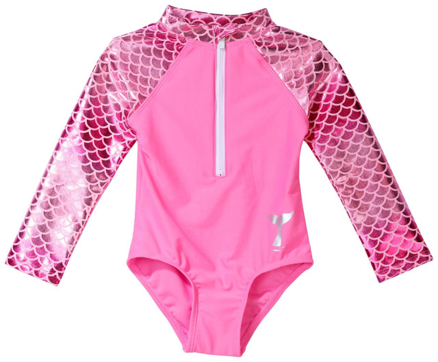 Make a splash in our Pink Mermaid Rash Guard Swimsuit for baby girls! Featuring UPF 50+ sun protection, a 3/4-zip front with a chin guard, and dazzling foil scale print raglan sleeves. Fully lined for comfort and crafted with stretch for the perfect fit. Fabrication: 86% polyester, 14% spandex. Lining: 100% polyester. Perfect for sunny beach days and poolside play.