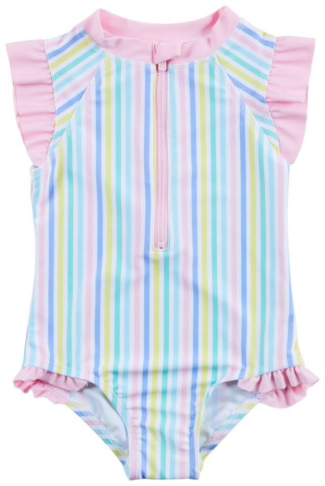 Introducing the Baby Girls Candy Stripe One Piece Swimsuit, made from a blend of polyester and spandex for a comfortable fit. This stylish swimsuit features a vibrant stripe print, a quarter zip collar, and short sleeves. With UPF 50+ protection, it ensures your little one stays safe from the sun while enjoying water activities. Perfect for beach days or poolside fun, this swimsuit combines fashion and functionality seamlessly.