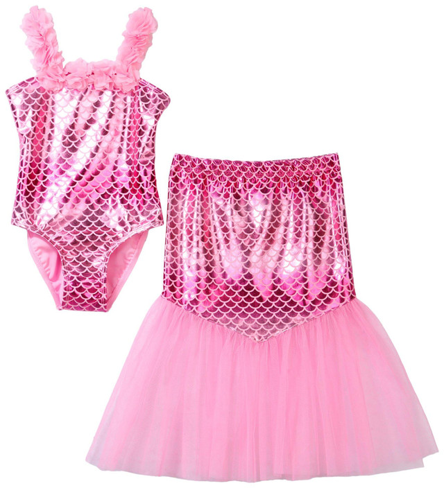 Make a splash with this 2-piece Mermaid Swimsuit Set! This enchanting swimwear features a magical reflective print that shimmers in the sunlight, perfect for your little mermaid. The set includes a stylish top and matching bottoms, designed for a comfortable and secure fit.
