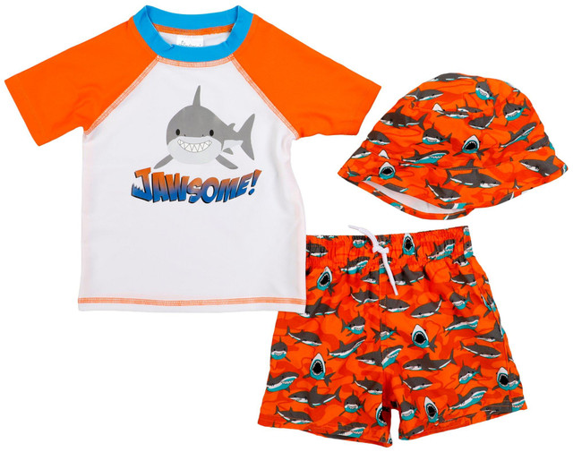 Keep your little one protected and stylish with this toddler boys 3 pc swim set. Featuring a short raglan sleeve rash guard with built-in UPF 50+ sun protection. The shark print swim shorts offer a playful, ocean-inspired design, while the matching sun hat provides added coverage for all-day beach or poolside adventures. Ideal for summer vacations, water parks, and backyard splash days. Fabrication is: Shirt 82% polyester, 18% spandex, Shorts 100% polyester.
