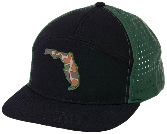 Style your next group outing with this Florida Camo Black Caps. The hat is made of 100% polyester for durability, and they are designed with mesh panels on the backs for comfortable ventilation. Features a Camo Florida Map Patch on the front.