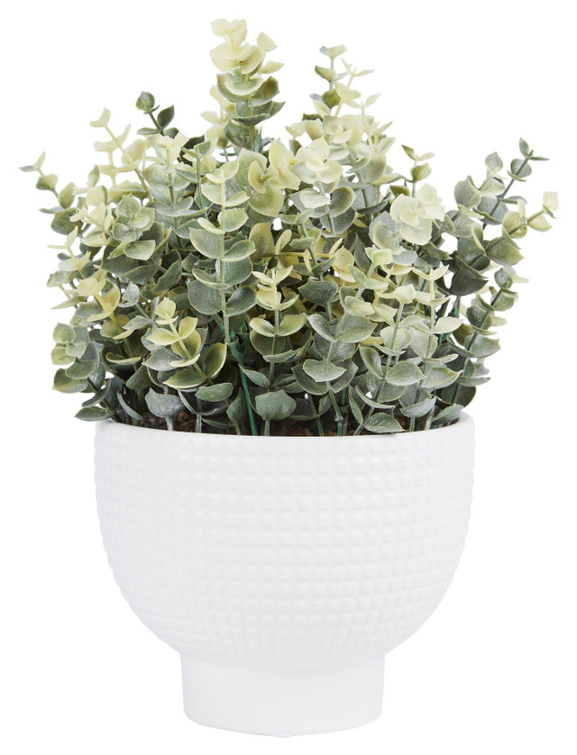 Enhance your space with our 12 in Decorative Eucalyptus Plant. This charming home accent features lifelike eucalyptus leaves arranged in a stylish ceramic pot. Perfect for your desk, shelf, or any small nook, this decorative plant brings a touch of greenery and sophistication to your decor. Measures approximately 12 in x 7 in.
