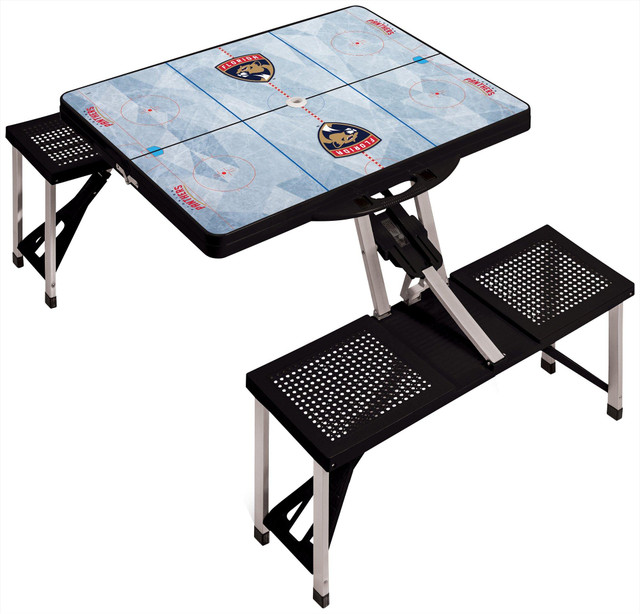 This picnic table is a compact fold-out table with legs and seats that fold into the table when collapsed. Maximum weight capacity of 250 lbs. per seat and 20 lbs. for the table. Compatible with standard sized beach umbrellas. Open: 54'' x 34'' x 25.8'' Folded: 33.5'' x 4'' x 13.''