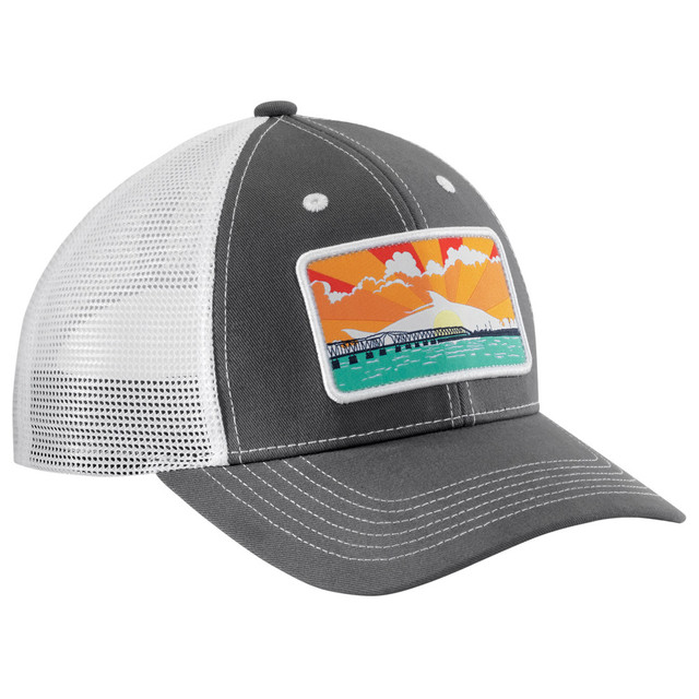 The Flying Fisherman Sunrise Tarpon Trucker Hat features a charcoal gray crown and bill, white mesh back, and a woven patch of tarpon fishing at Bahia Honda Bridge. With a six-panel build, dark gray non-glare undervisor, and adjustable snapback closure, it offers comfort, style, and sun protection. Finished with a Flying Fisherman logo tag, its perfect for anglers.