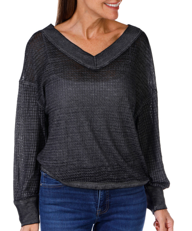 For the Republic Womens Long Sleeve Waffle V-Neck Top