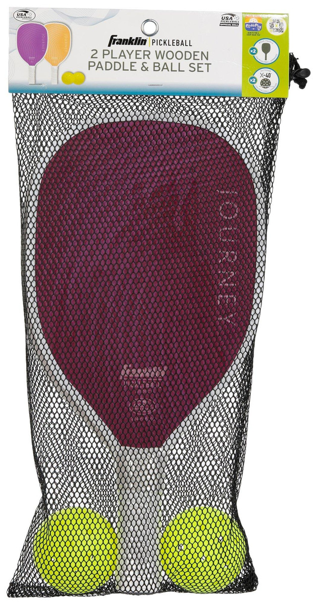 The Franklin Sports 2 Player Pickleball Set is a classic outdoor game that will bring hours of fun for all ages. The set includes all you need for a day of fun: (2) Wood Paddles and (2) X-40 Pickleball Balls, and a convienient mesh carrying bag. Perfect for beginners.