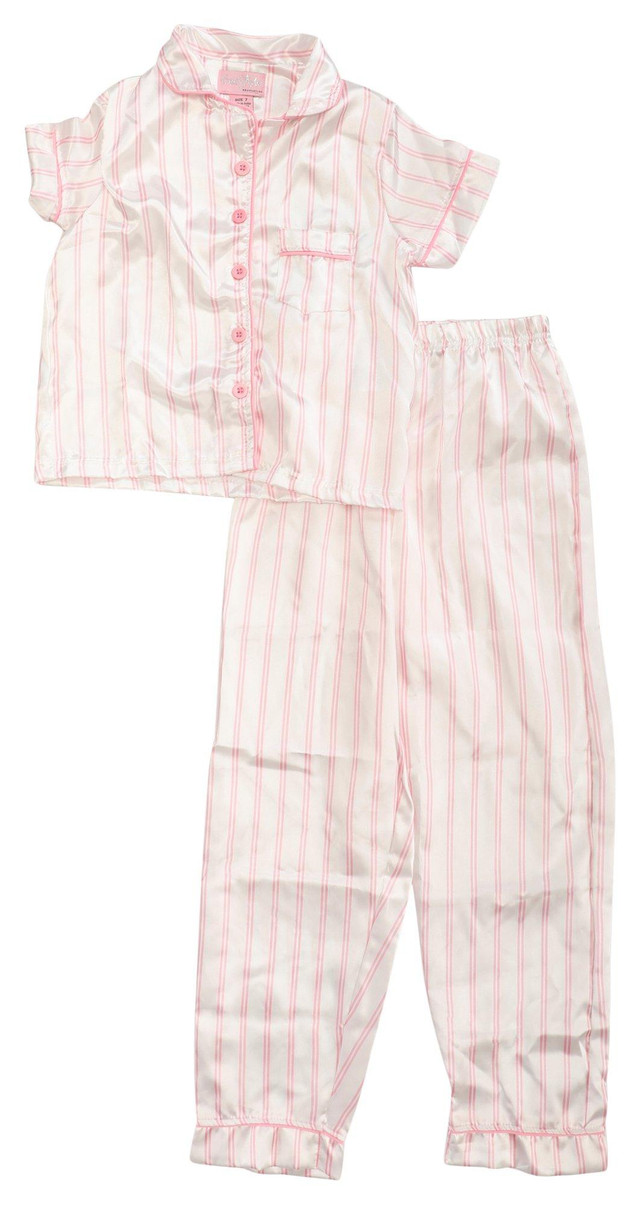 Add classic comfort to bedtime with the Big Girls 2 Piece Striped Satin Pajama Pants Set. Designed in pink satin with dark pink stripes, the set includes a short sleeve button down front top and elastic waist long pants for a relaxed fit. Ideal for cozy nights and sleepovers. Fabrication is 100% polyester.