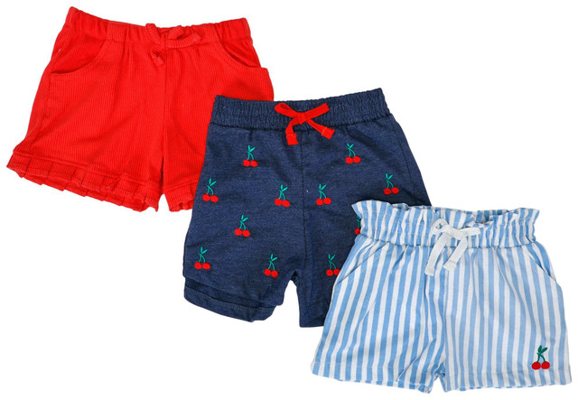 Add a splash of playful charm to her summer style with this 3 pack of toddler girls shorts. Each pair features a fun cherry inspired print and a comfy elastic pull on waistband for easy dressing. Perfect for warm weather adventures and everyday fun.