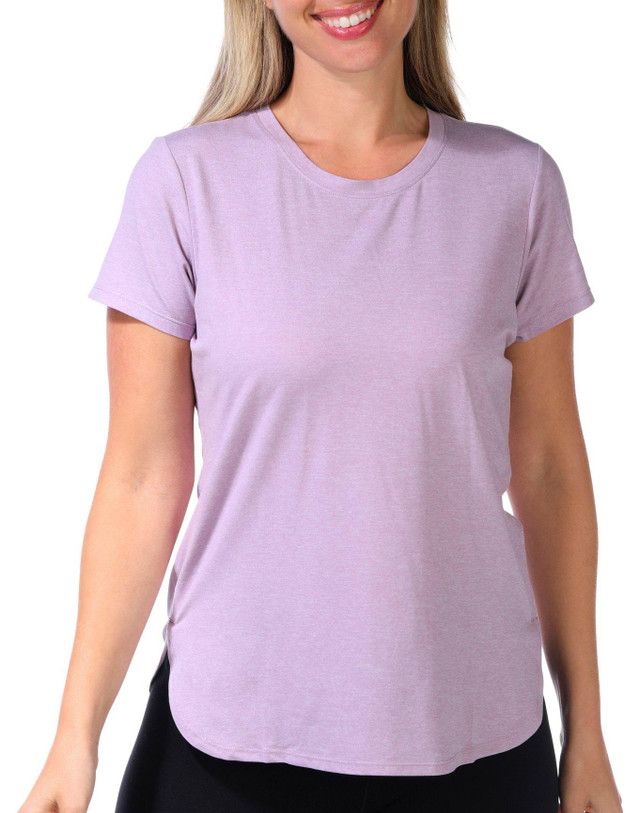This women's active Everyday Performance tee features a classic crew neckline, short sleeves, and a soft heathered finish. Engineered with OMI DRY technology, it delivers moisture control and breathable comfort for all day wear. Fabrication 87% polyester, 13% spandex