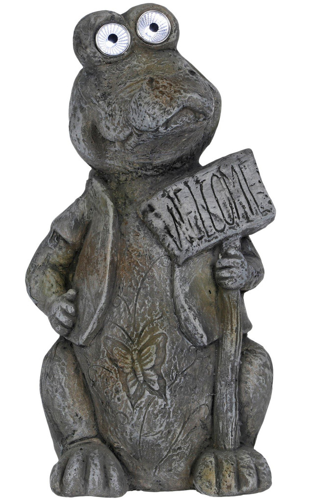 Brighten your outdoor space with this 19-inch solar alligator with a scripted welcome message garden figurine. Featuring a detailed alligator design it absorbs sunlight by day and softly glows at night. A delightful blend of nature and light, perfect for patios, gardens, or walkways.