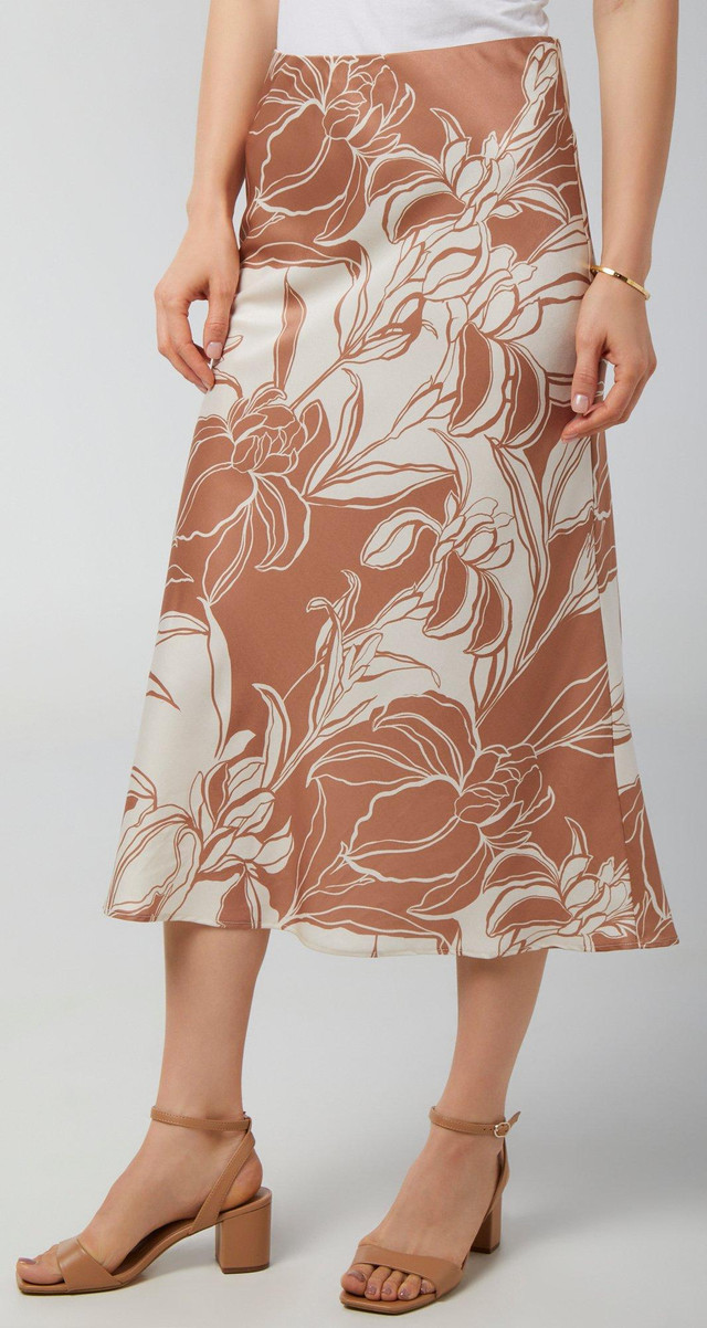 Turn heads with every step in this flowy satin skirt, featuring a vibrant print pattern and an easy pull-on waistband. The silky fabric glides effortlessly, offering a flattering drape and all-day comfort. Whether paired with a simple tee or a dressy blouse, its your go-to for standout style with minimal effort. Length measures approximately 34 inches.