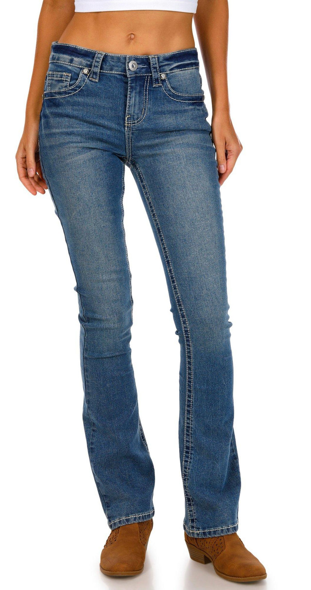 Shine with standout style in these Juniors Star Bling Boot Cut Jeans. Featuring a classic 5-pocket cut, boot cut fit, and button-fly zip closure, the star bling design on the back pockets adds a bold, playful touch to your denim collection. Fabrication 69% cotton, 26.5% polyester, 3% viscose, 1.5% spandex