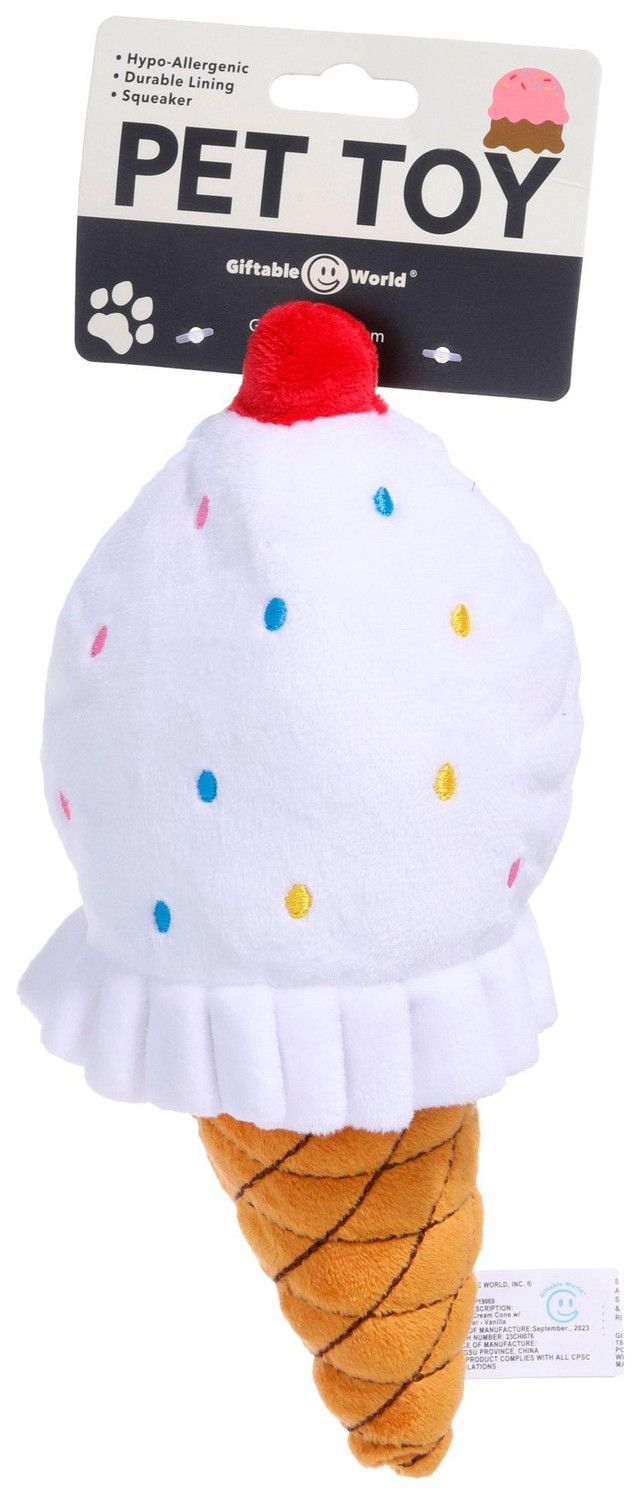 Playtime just got sweeter with this ice cream cone dog toy! This soft, plush pet toy serves up a swirl of fun with its soft, plush texture and irresistible squeaker inside. Designed to look like a tasty treat, its perfect for pups who love to chew, tug, or snuggle. Fabrication is 100% Polyester. Measures approximately 10 in x 5 in.