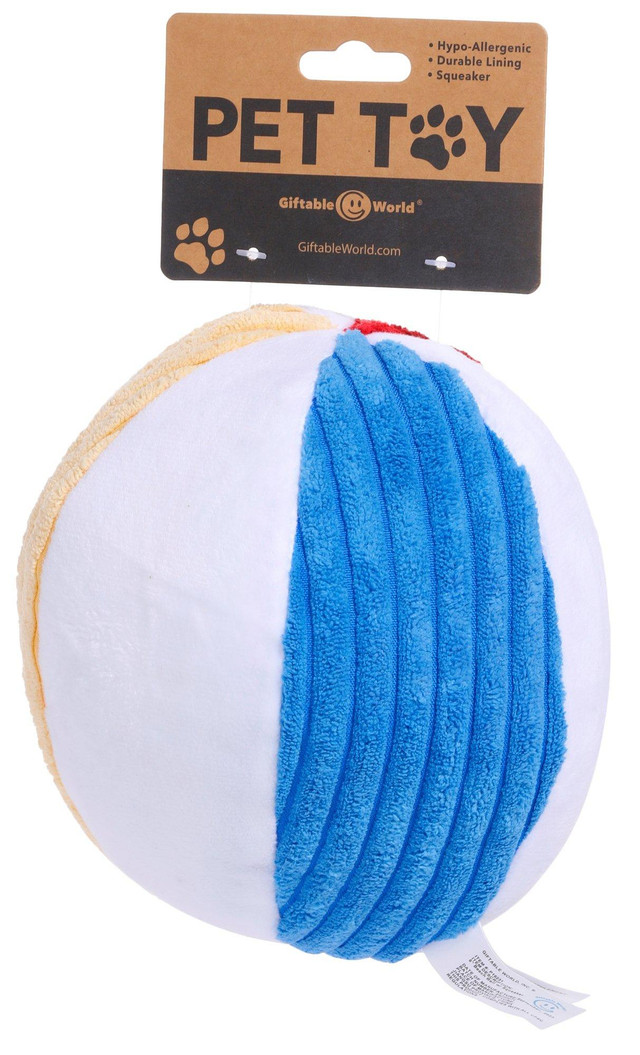 Add a splash of fun to playtime with this beach ball dog toy! This plush beach ball is built for excitement, with a squeaker inside. It's soft yet durable, perfect for cuddles or energetic games of fetch. Fabrication is 100% Polyester. Measures approximately 6 in.