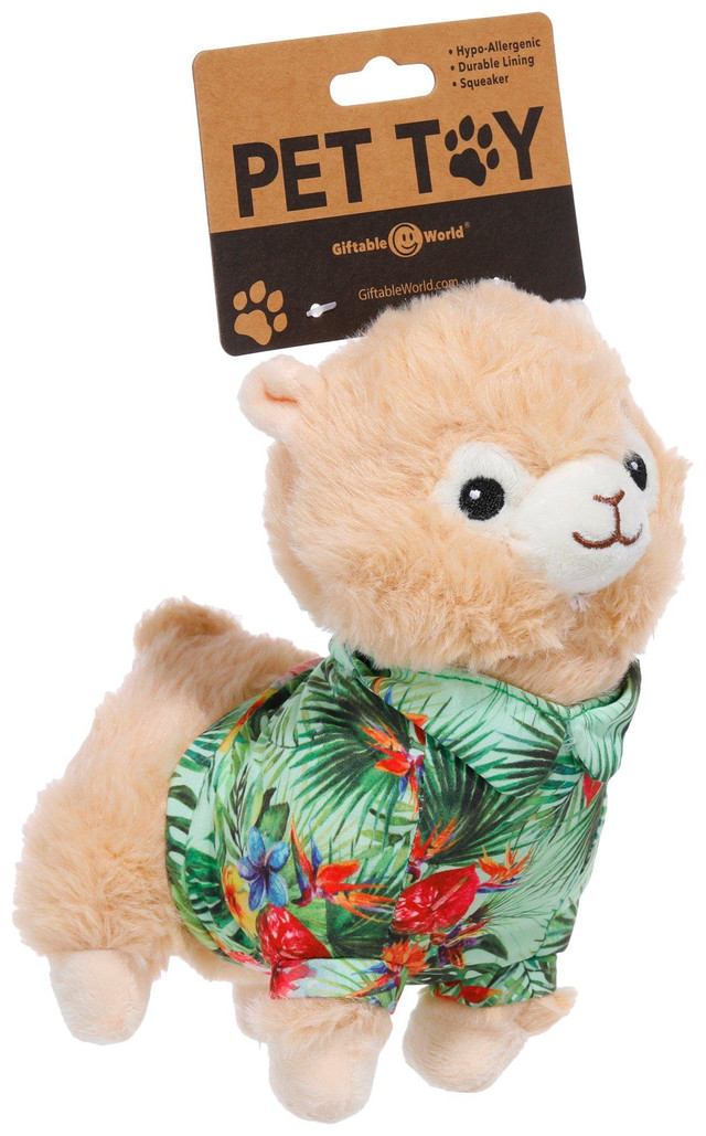 Turn up the playtime charm with this alpaca dog toy! This soft, plush pet toy is built for excitement, with a squeaker inside. It's soft yet durable, perfect for cuddles or energetic games of fetch. Fabrication is 100% Polyester. Measures approximately 7 in x 7 in x 4 in.