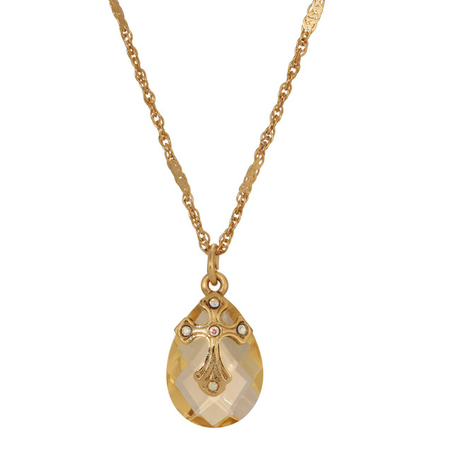 Elevate your style with this elegant glass drop cross necklace. Featuring a stunning Briolette crystal pendant and a 14k gold-dipped cross, this piece is adorned with delicate crystal accents. Its sophisticated minimalist design makes it perfect for both holiday celebrations and everyday wear. Embrace the timeless beauty and versatility of this exquisite necklace, a must-have addition to any jewelry collection. Length 16 in., width 13mm.