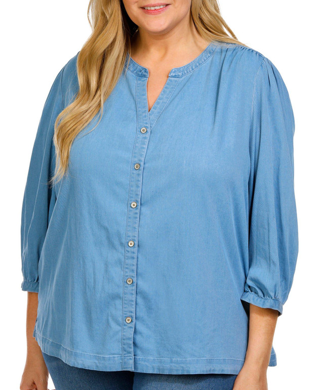 Discover effortless style with this Long Sleeve Buttoned Top, designed with a chic denim-style look. This top combines the classic appeal of denim with the comfort of breathable, lightweight fabric. The soft touch ensures all-day comfort, making it perfect for any occasion. The buttoned front adds versatility, allowing you to style it open or closed. Fabrication is 64% lyocell, 24% polyester, 10% viscose, 2% spandex.