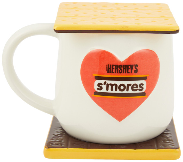 Add a whimsical touch to your drinkware with the Hersheys Smores Coffee Mug with Lid. Styled to resemble a classic smores, it features a marshmallow shaped mug with a heart detail and a graham cracker inspired lid and base. Ideal for gifting or enjoying warm beverages during cozy moments. Fabrication is 100% ceramic. Measures approximately 4.75 in x 6 in x 4 in.