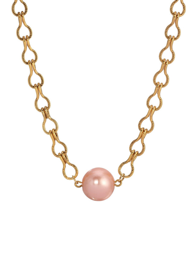This elegant necklace features a delicate 14k gold dipped latter chain with intricately designed links, leading to a stunning raspberry faux pearl pendant that serves as the focal point. The smooth, lustrous pearl contrasts beautifully with the textured chain, creating a harmonious balance of simplicity and sophistication. Perfect for adding a touch of grace to any outfit, this piece is ideal for both casual and formal occasions. Length 16 in., width 21 mm.