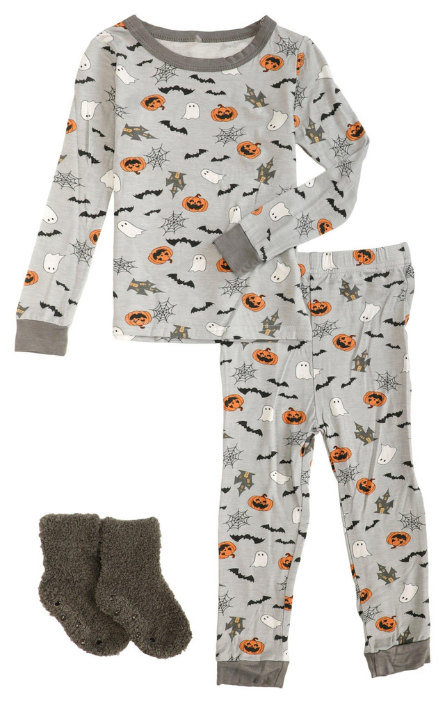 Add spooky fun to bedtime with the Boys 2 Pc Halloween Long Sleeve Pajama Set. Featuring fuzzy socks with a long sleeve and long pant set with halloween graphics, it offers the perfect option for cozy nights. Ideal for keeping little ones warm and comfortable. Fabrication is 95% rayon, 5% spandex.