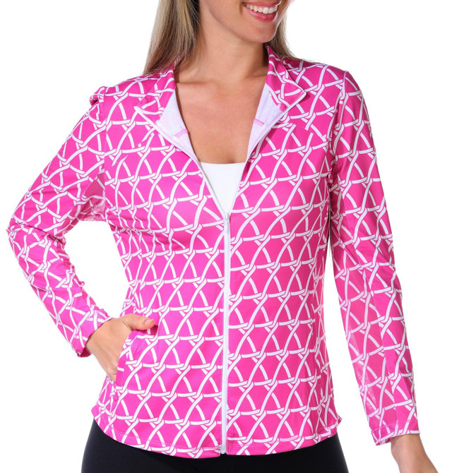 This women's active zip up jacket features a pink tile print with a full front zip closure, performance stretch, and flatlock stitching. Designed with moisture wicking and quick dry fabric, it offers comfort and mobility for workouts or everyday wear. Fabrication 88% polyester, 12% spandex
