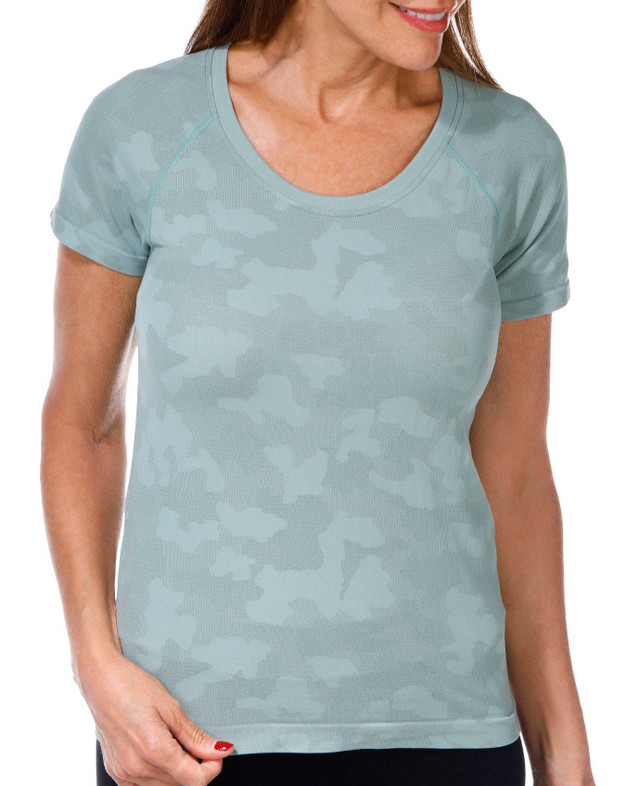 This womens active seamless tee features a classic crew neckline and short sleeves for a comfortable fit. The stylish print adds a modern edge, while the seamless design offers smooth performance and all day ease whether at the gym or on the go. Fabrication 92% nylon, 8% spandex