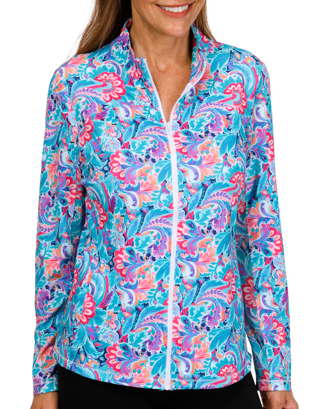 Stay comfortable and stylish during outdoor activities with the Womens Active Long Sleeve Zip Front Jacket featuring an eye catching print, front pockets and a zippered front design ideal for layering. Performance fabric offers moisture wicking, quick dry, cooling, and 4 way stretch. Fabrication is 88% polyester 12% spandex. Length measures approximately 26 in.