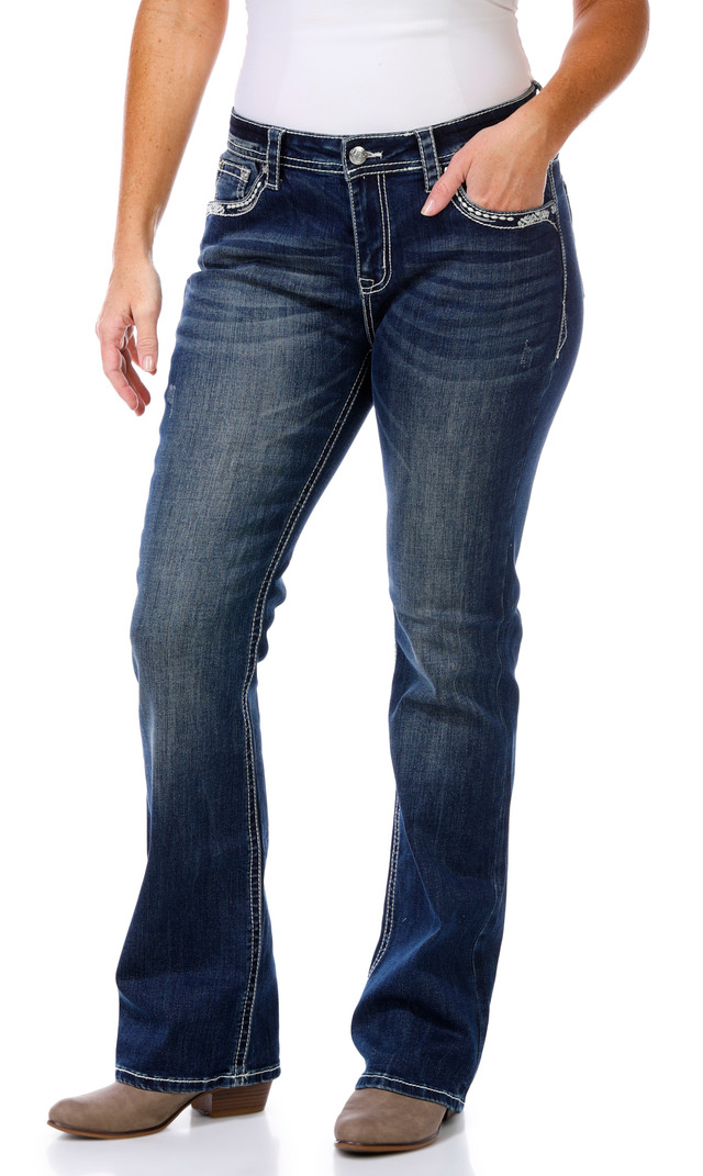This chic dark wash jean brings effortless style with a touch of glam. Featuring intricate embroidered back pockets with a vintage wing design and sparkling embellishments, it's the perfect blend of casual comfort and standout detail. Inseam is approximately 32 inseam. Fabrication is 67% cotton, 31% polyester and 2% elastane.