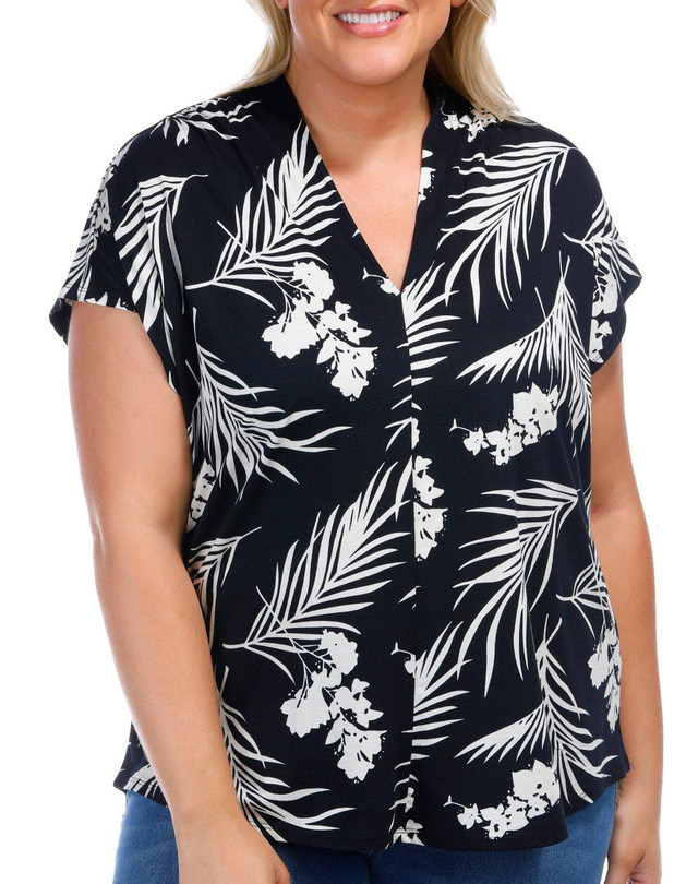 Stand out in a crowd with this Plus Short Sleeve V-Neck Print Top. Pair with a dress pant or skirt for a perfectly put together look to go out, or with jeans for a weekend shopping trip. Fabrication is 60% Cotton, 40% Modal. Top length measures approximately 29 in.