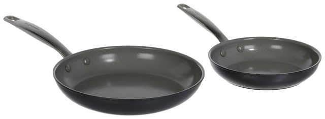 Elevate your everyday cooking with this versatile Ceramic Nonstick Frypan Set, perfect for scrambles, sautés, and frying. Featuring Thermolon healthy ceramic nonstick coating, it's completely free of PFAS, PFOA, lead, and cadmium. The durable construction ensures even heat distribution, while the stay-cool handles provide a secure, comfortable grip on any stovetop. Diameters measure approximately 8 in and 10 in.