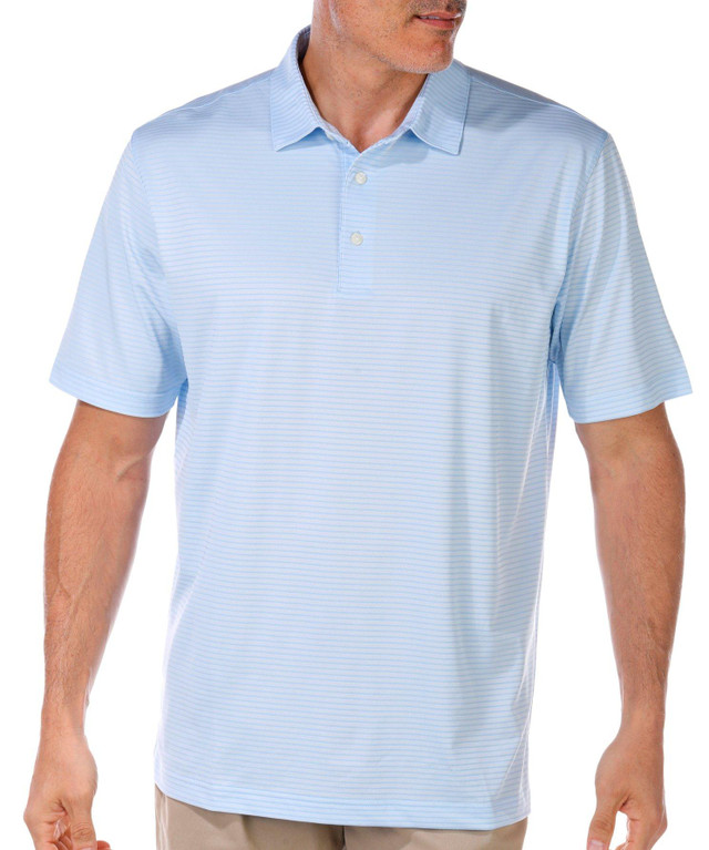 Elevate your everyday look with this Men's Short Sleeve Knit Pique Striped Polo. Designed with a classic collar and bold stripes, it features performance stretch for comfort and built-in UPF sun protection. Fabrication 90% polyester, 10% spandex