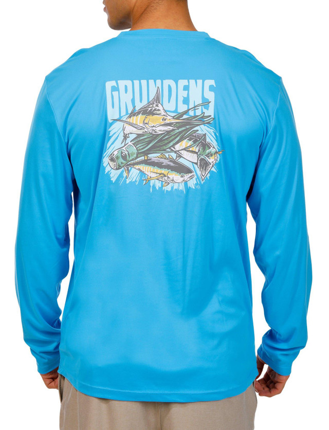 This mens long sleeve performance tee is made with lightweight, stretchy fabric that offers sun protection, moisture wicking, and antimicrobial properties. Designed for active comfort and freshness in any setting. Fabrication is 100% polyester.