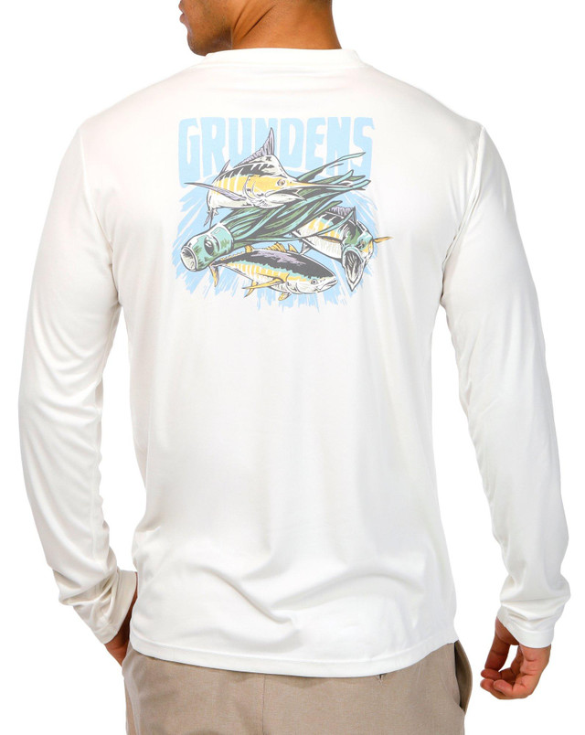 This mens long sleeve performance tee is made with lightweight, stretchy fabric that offers sun protection, moisture wicking, and antimicrobial properties. Designed for active comfort and freshness in any setting. Fabrication is 100% polyester.