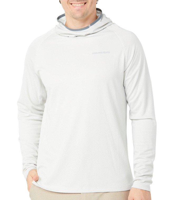 This men's long sleeve performance shirt with hoodie features activated cooling technology, antimicrobial properties, and stain resistance. Built for lightweight comfort and freshness in active or outdoor settings. Fabrication is 100% polyester.