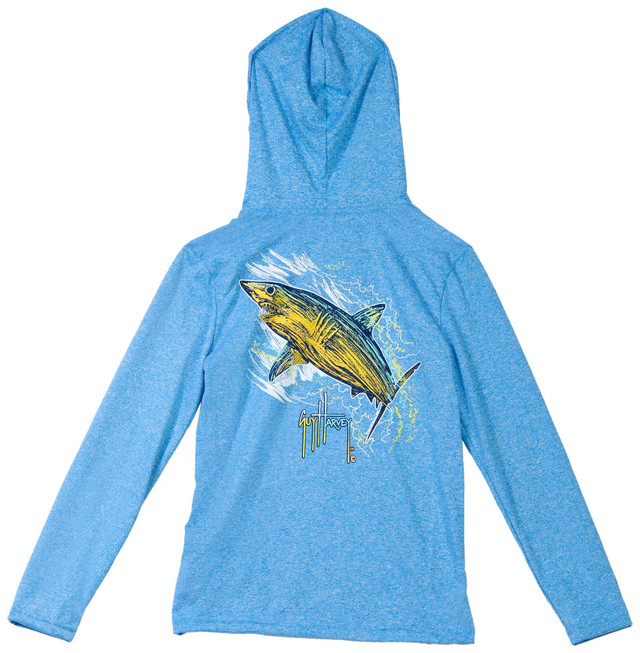 This big boys long sleeve active shirt features a hood and stretchy heathered fabric for all day comfort. Branded with a bold fish screen print, it blends sporty style with outdoor vibes, perfect for active days, school, or weekend adventures.