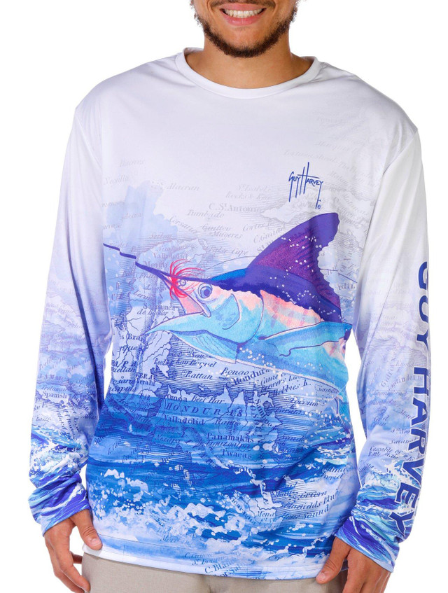 Gear up for adventure with the Men's Long Sleeve Atlantic White Performance Tee. Featuring a crew neckline and long sleeves, this tee showcases an Atlantic Ocean-inspired graphic, moisture-wicking fabric, and UPF 40 sun protection. Fabrication 100% polyester