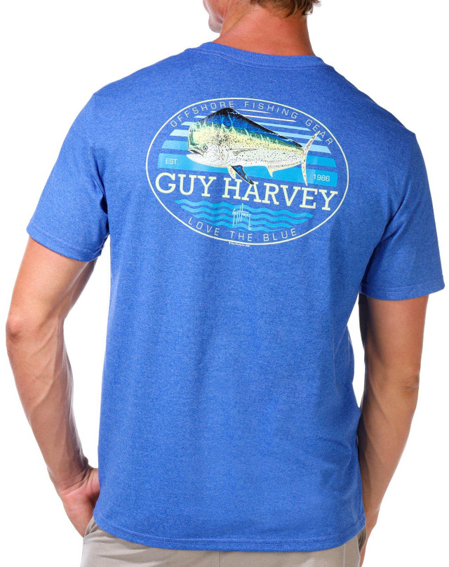 This mens retro mahi t shirt features a classic crew neckline and short sleeves for all day comfort. Brand script accents the front chest while a bold mahi graphic on the back adds a vintage inspired coastal vibe. Fabrication 50% cotton, 50% polyester