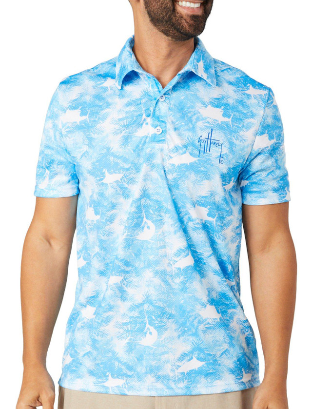 Stay cool and protected in the Men's Urban Palms Polo Shirt. Featuring an all-over fish print, this polo combines style with function. It features a classic neckline, short sleeves, UPF 40 sun protection, and moisture-wicking fabric for all-day comfort. Fabrication is 100% polyester.