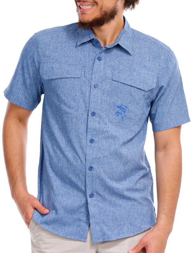 Guy Harvey features his award-winning marine artwork on this coastal short sleeve shirt. It features a solid color design on lightweight woven fabric, a point collar, full button front closure, two chest flap adhesive closure pockets, a fully vented back panel to keep you cool, sun protection, moisture-wicking and quick-dry technology.