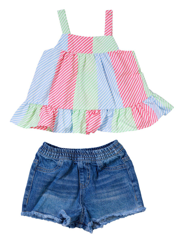 This 2 piece set includes a striped top and denim shorts. The top is made from 100% polyester. Machine wash cold and tumble dry low. The denim shorts are made from 100% cotton. Machine wash cold inside out and tumble dry low. A cute and comfy outfit for everyday wear.