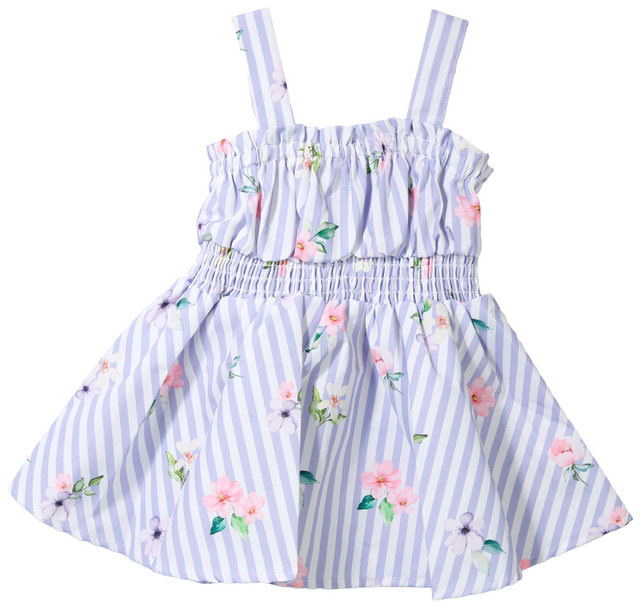 This purple striped sundress from Habitual is a charming choice for warm days. Soft-hued stripes and scattered pink flowers create a sweet look, while smocking at the waist adds a comfortable fit. Designed with an elastic waist for easy wear, this fit-and-flare dress slips on effortlessly. Made from 100% polyester, it is lightweight and perfect for any sunny occasion.