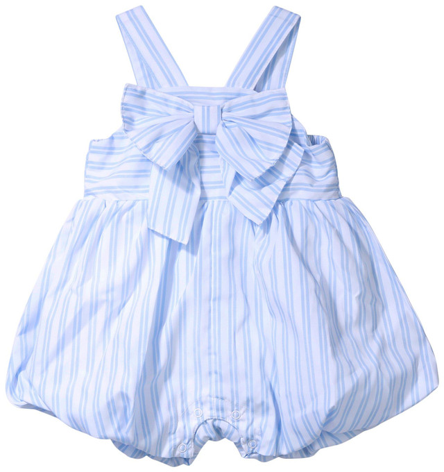 This adorable baby girl bubble romper is perfect for sunny days. A floppy bow adds a sweet touch to the lightweight striped design, while smocking at the back ensures a comfortable fit. Snaps between the legs allow for easy changes. Made from 100% polyester, it is soft, breathable, and easy to care for with machine wash and tumble dry convenience.