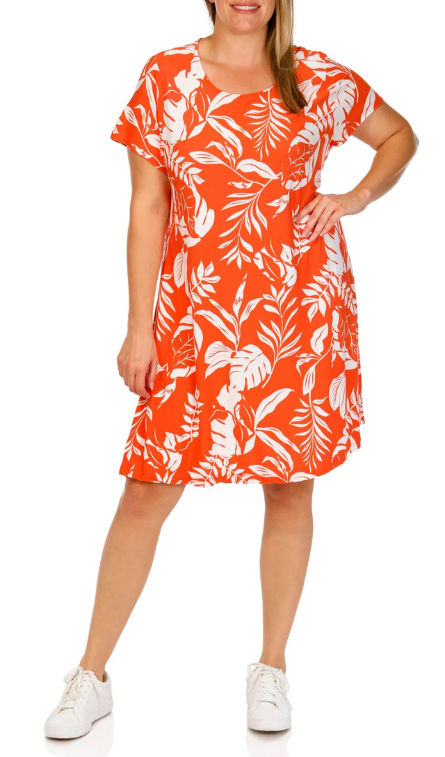 Effortlessly stylish and breezy, this Plus Short Sleeve Botanical Swing Dress features a leaf print, a classic crew neckline, and soft, comfortable fabric that moves with you. Perfect for warm days and easy layering. Fabrication is 92% polyester, 8% spandex