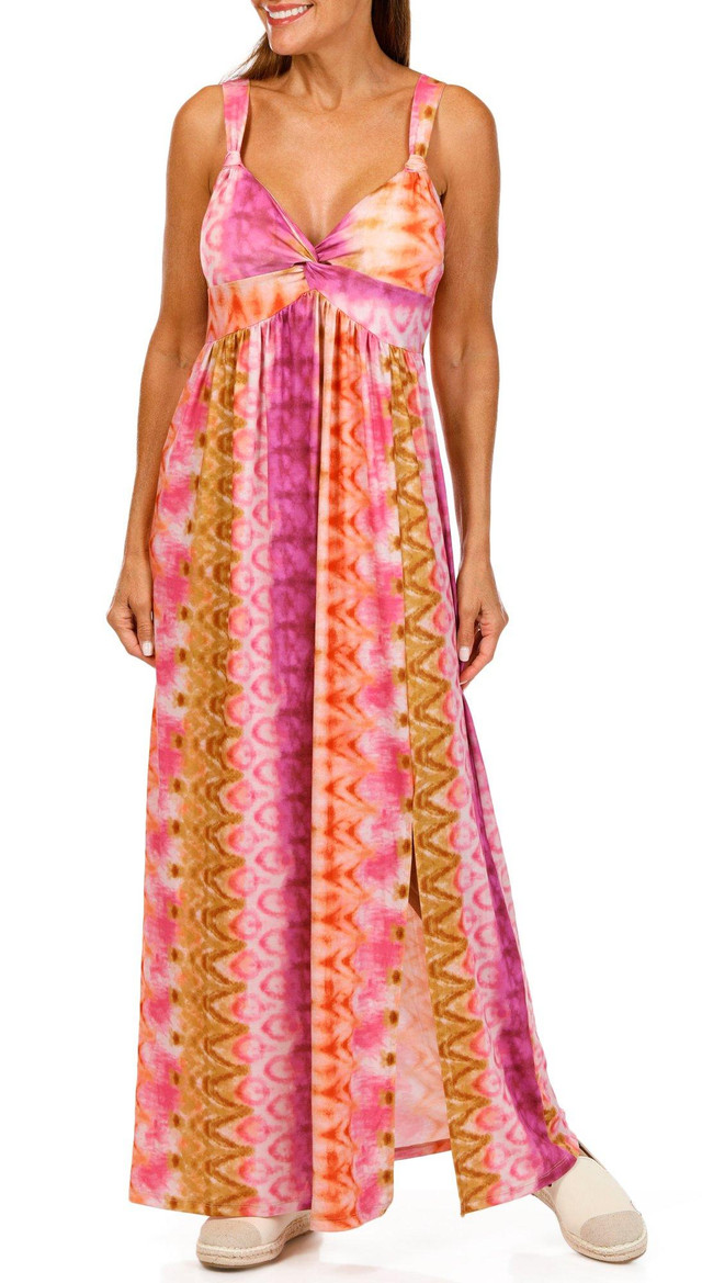 This Sleeveless Maxi Dress features a chic tie dye print, knotted straps, and a stylish front twist detail. Flattering and flowy, it's perfect for effortless summer style and all day comfort. Fabrication is 95% polyester, 5% spandex.