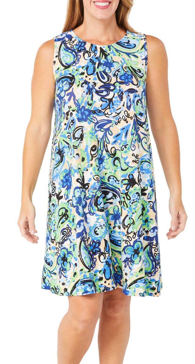 The Women's Sleeveless Swing Dress combines comfort and style with its flowy silhouette and tropical print. Designed to flatter every body type, this dress offers a relaxed fit and soft fabric that moves with you. Perfect for warm weather, it is ideal for casual outings or dressing up for special occasions. Fabrication is 92% polyester, 8% spandex