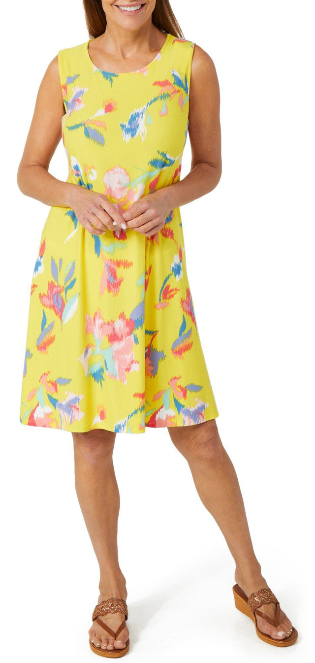 Breeze through sunny days in the Women's Sleeveless Swing Dress, featuring a multicolored print, crew neckline, and a stylish back keyhole detail. Its flowy silhouette offers effortless charm and comfort for warm-weather outings. Fabrication is 92% polyester, 8% spandex
